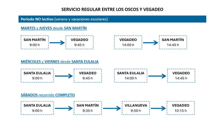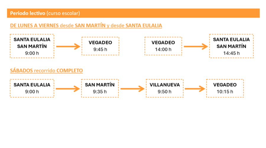 Realizamos el servicio de transporte regular de viajeros entre Vegadeo y Los Oscos, tanto a Santa Eulalia, como a Villanueva y San Martín.